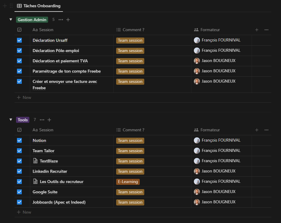 Bastien peut alors consulter l’ensemble de son programme à l’avance. Cet espace Notion est organisé en forme de Check-List où c’est à lui de venir cocher les cases une fois les modules réalisés (cf. photo ci-dessus).
